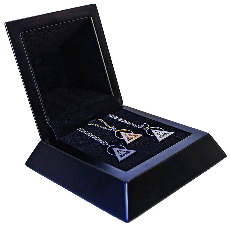 Crafted in polished wood with the Illuminati’s symbol laser engraved on its lid, the Trifecta Elite pyramid holds the Illuminati Talisman in gold, silver rhodium, and black (available only in this edition).